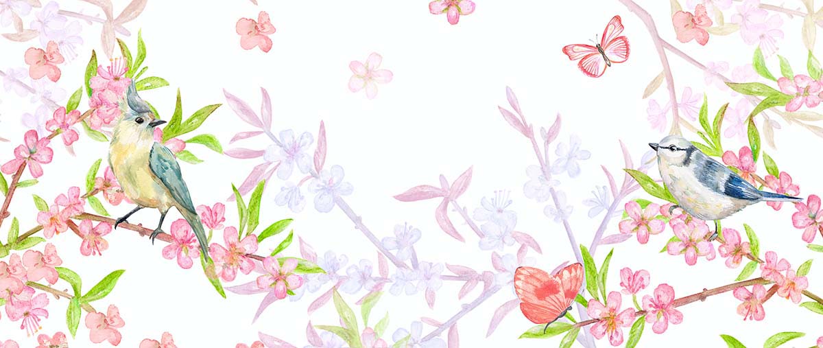Fotobehang aquarel geverfde bloemen, vogels en vlinders: precies passend op jouw maat