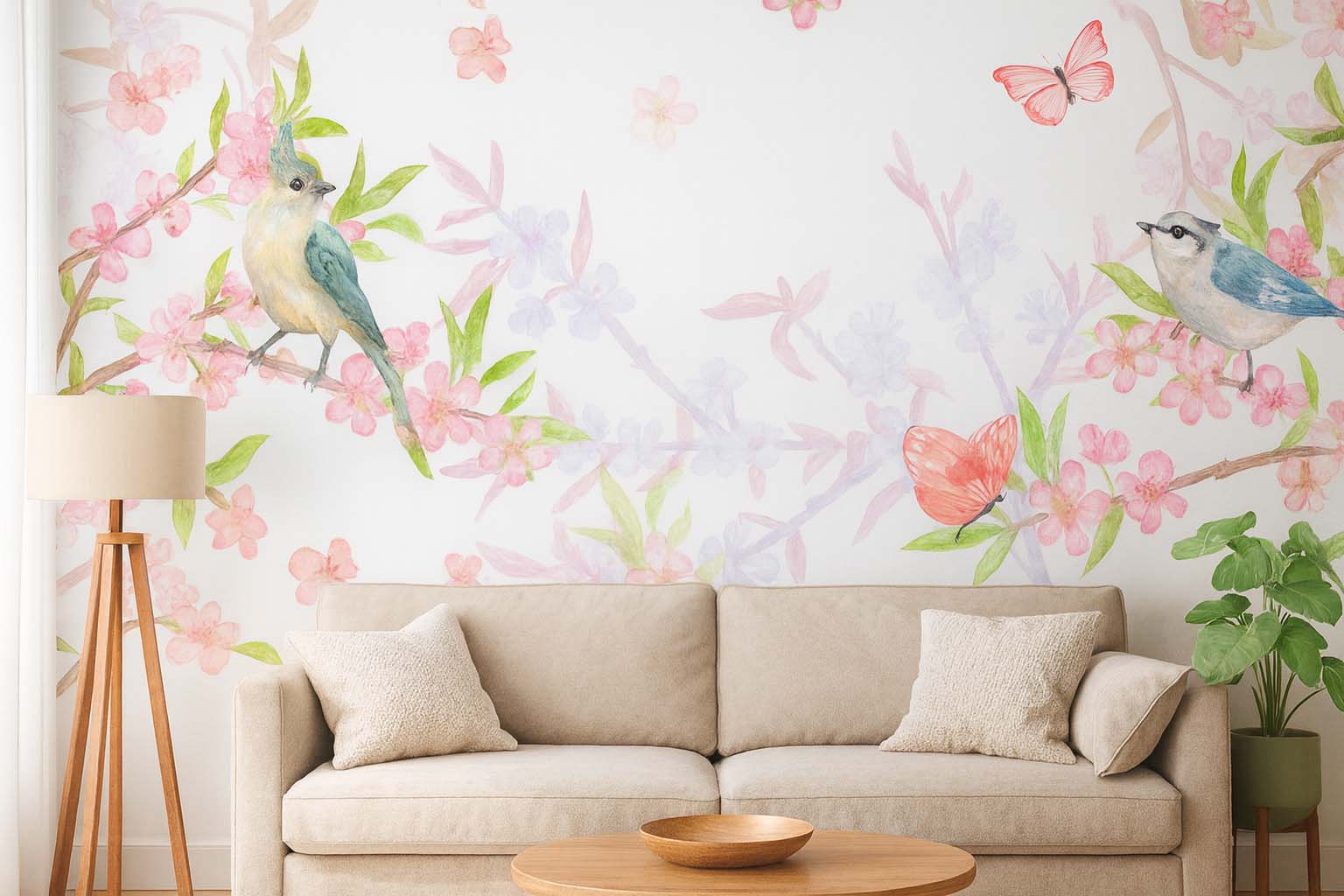 Met Fotobehang aquarel geverfde bloemen, vogels en vlinders haal je bloemenzachte kleuren in aquarelstijl in huis. Het ontwerp voelt warm en uitnodigend en geeft de ruimte direct een ontspannen sfeer.
