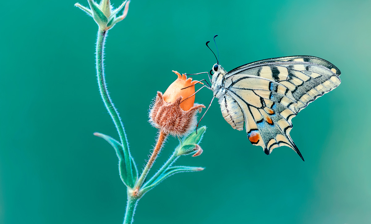 Fotobehang mooi gekleurde vlinder op bloem geeft de muur een speels, licht gevoel: bloemenzachte kleuren zorgen voor een vrolijke blikvanger zonder te overheersen.