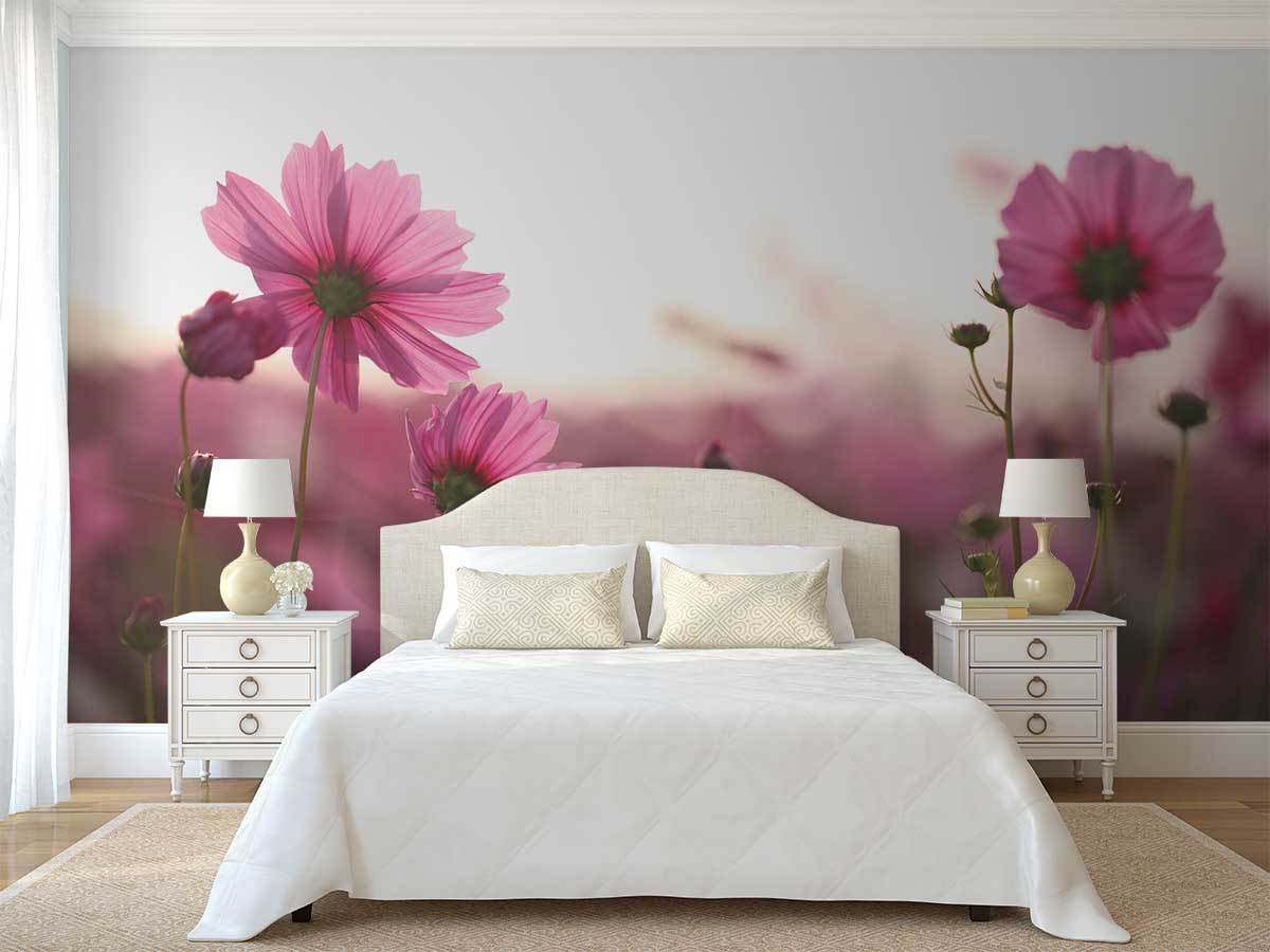 Fotobehang roze bloemen geeft de muur een speels, licht gevoel: bloemen, roze tinten zorgen voor een vrolijke blikvanger zonder te overheersen.