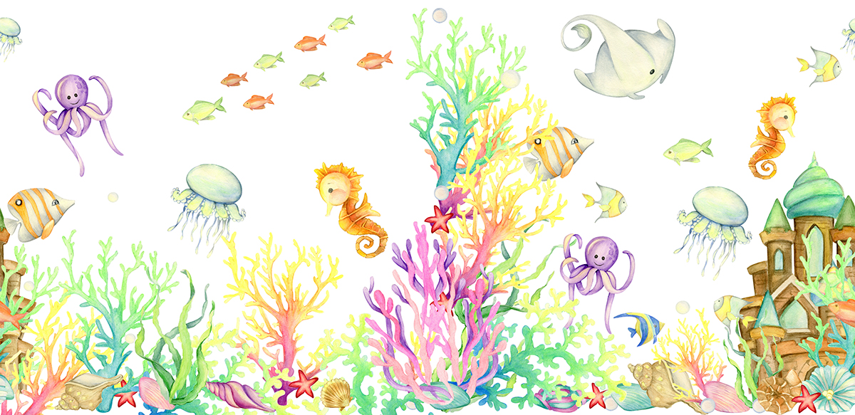 Fotobehang aquarel onderwater wereld nodigt uit om te spelen en te dromen. Ontdekkingsreis in aquarelstijl maken van de kamer een fijne plek om iedere dag in te ontdekken.