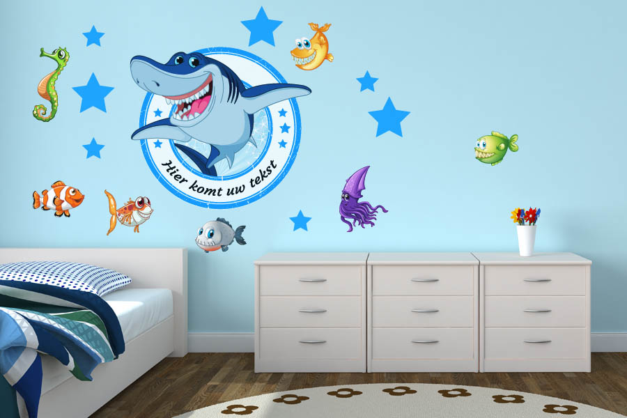 Begeef je in een ware onderwaterwereld met deze stoere muursticker set van meneer Haai en zijn diepzeevrienden. De haai, vissen en sterren zijn allen losgesneden en kunnen op iedere willekeurige plek geplakt worden. Uiteraard wordt deze sticker voorzien van jouw naam zodat het echt jouw muurdecoratie wordt.