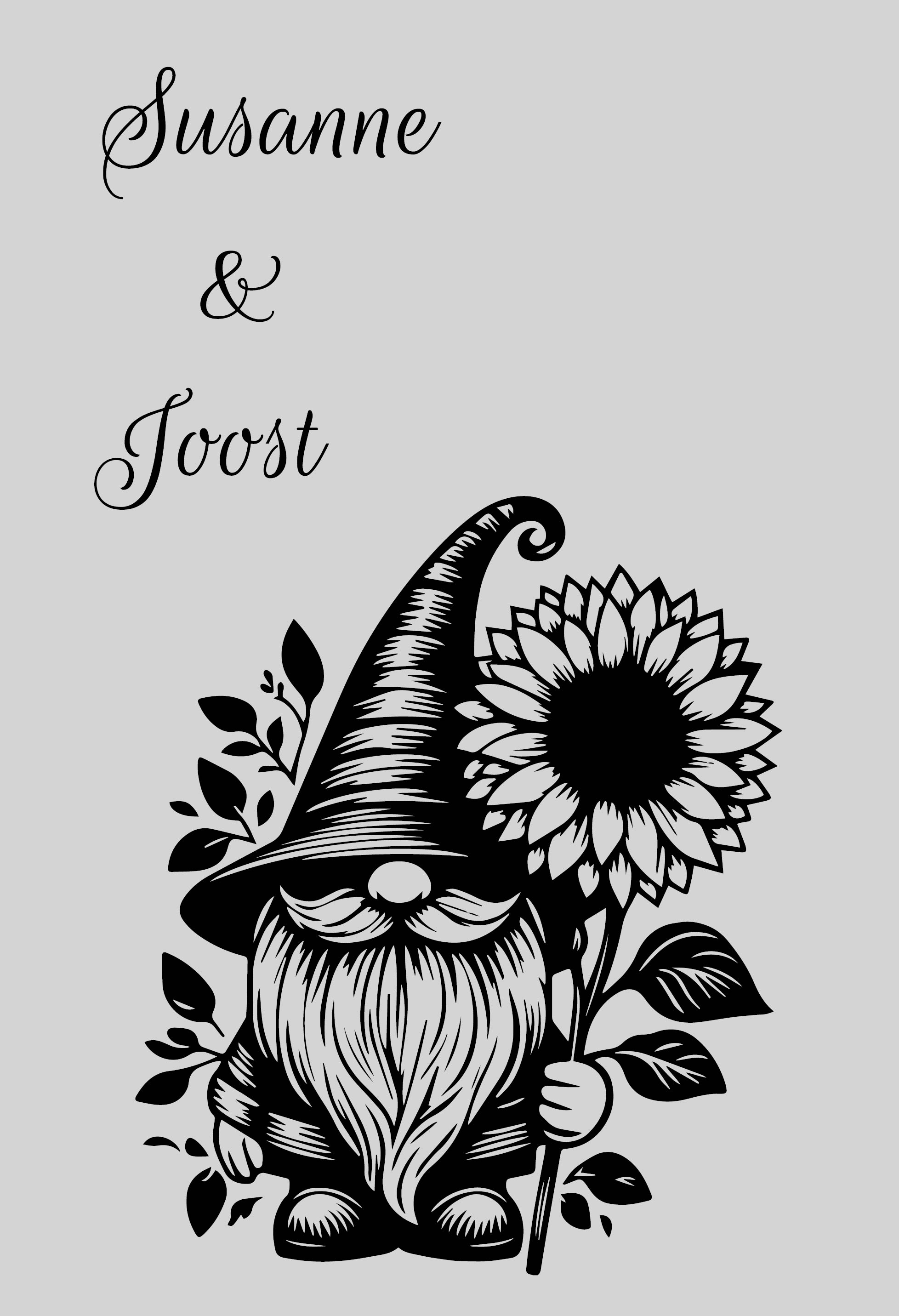 Geef je voordeurraam of binnenglas een warme, persoonlijke touch met deze gnoom (kabouter) die een zonnebloem vasthoudt. De sierlijke typografie met jullie namen maakt het ontwerp uniek voor jullie.. De hoogwaardige print zorgt voor een diepe zwarte illustratie met strakke details, terwijl het daglicht prettig binnen blijft vallen (andere kleuren zijn ook mogelijk).