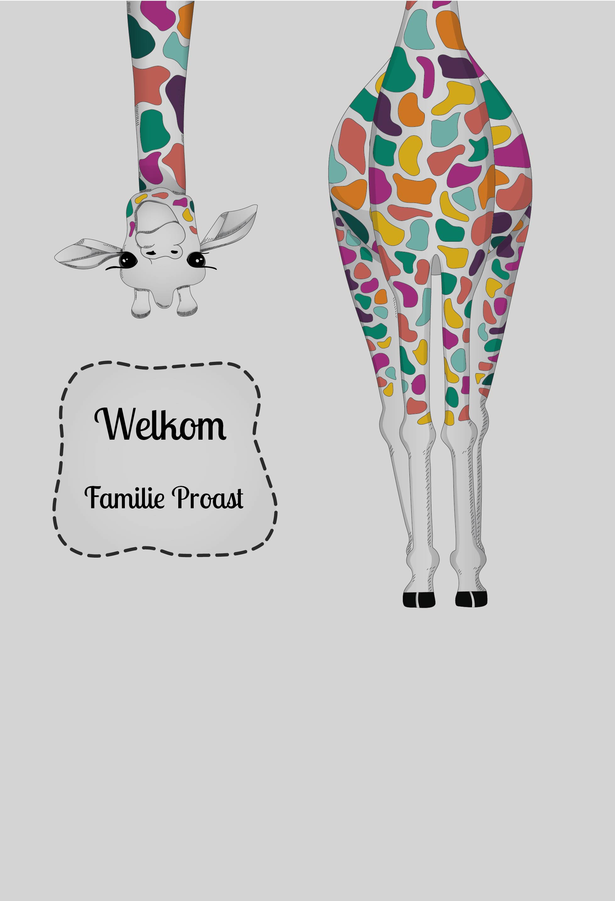 Over het ontwerp – Bedrukte raamfolie voordeur grappige giraf met welkom en naam