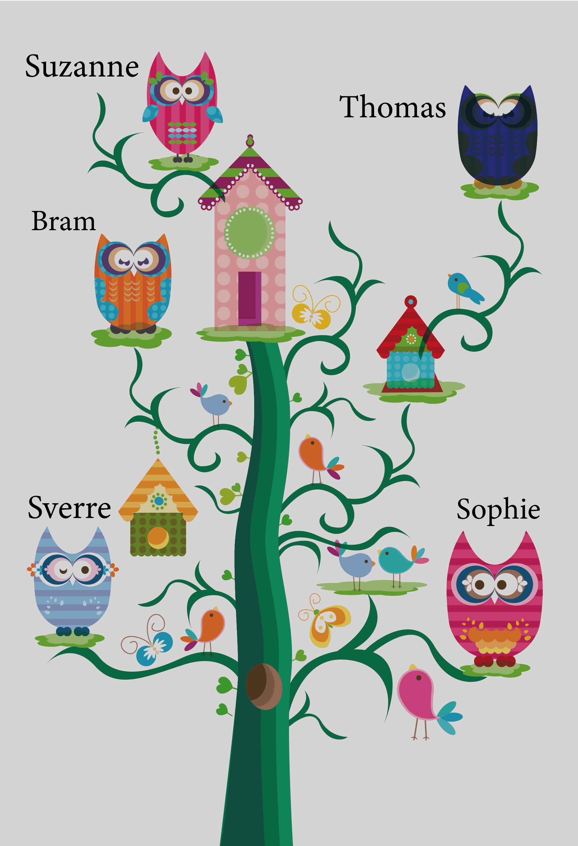 Over het ontwerp – Bedrukte raamfolie voordeur uilen stamboom met namen